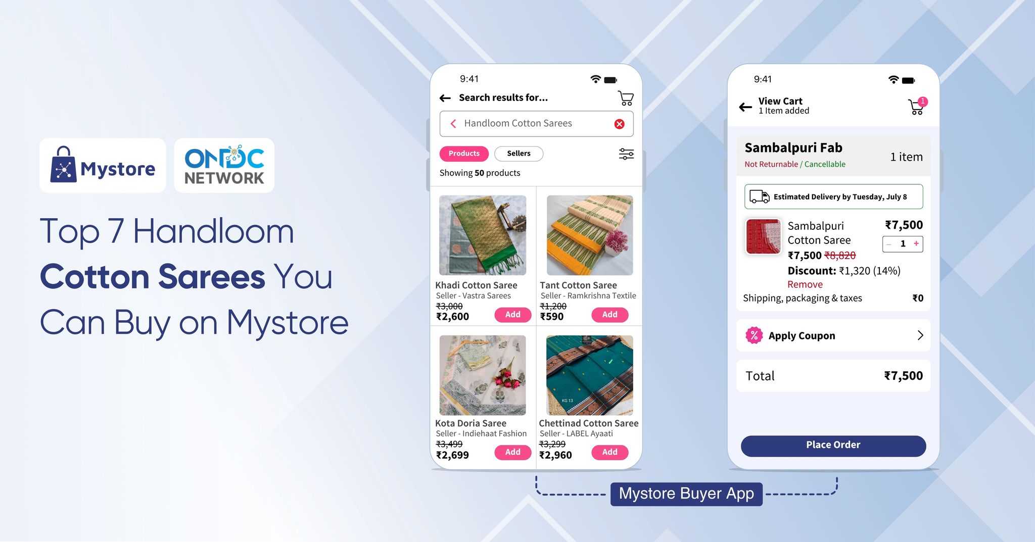 Go to the Mystore Buyer App, a leading buyer app on the ONDC Network, where you can explore a stunning collection of handloom cotton sarees from artisans, saree sellers, and fashion brands across the country, all at competitive prices and exclusive discounts. Whether you are looking for daily wear cotton sarees or unique pieces to elevate your wardrobe, there is something here for everyone.